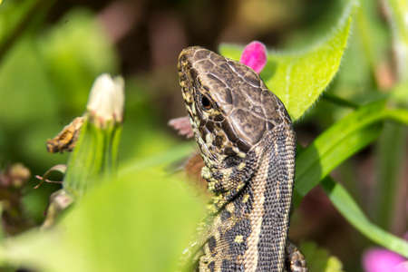 The head of a female lizard, macro photo of the head of a female lizard, Lacerta agilis