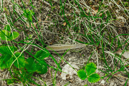 Wild sand lizard resting among grass and soil in early spring. Macro view of natural camouflage, detail of scales, and ground textures in untouched rural wildlife habitat
