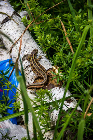 Green forest lizard, sitting on a tree. Wild lizard green. A brown-green lizard sits on a tree. Zootoca vivipara. Lizard from central Europe.