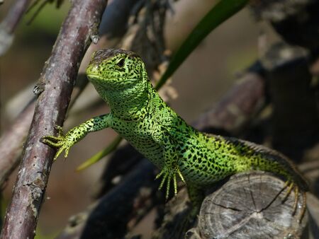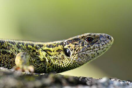 Male of true lizard, also known as wall lizard or lacerta, which turns green in mating season, on the clay stony slope in the Carpathians close-up in selective focus