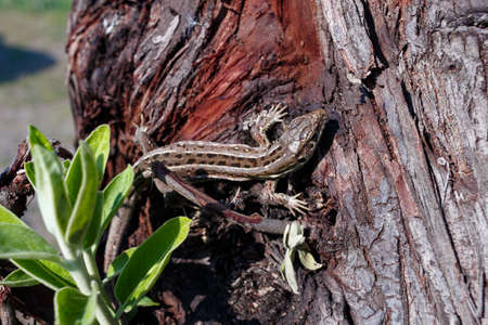 green forest spotted lizard on a wooden stump, lurking in the jungle, basking in the sun.