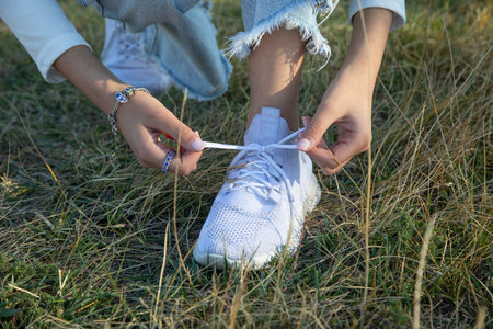 Close-up of hands tying the white laces of a sneaker, preparing for a run or workout. The image highlights an active lifestyle, athletic preparation, and the details of footwear functionality.