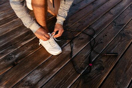 Close-up photo of young sportsman in sportswear tying shoelace, before workout with skipping rope, outdoors.