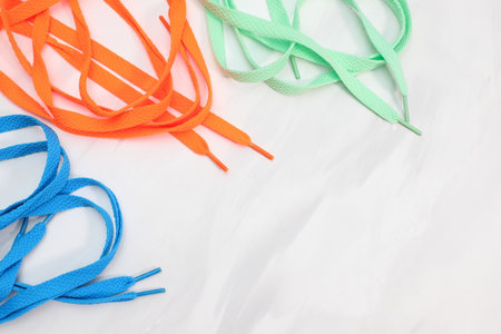 Different bright colors many shoe laces on white background