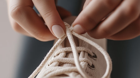 A person tying a shoe lace with their hands, AI