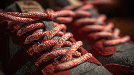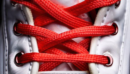 Bright red laces entwine perfectly on a pair of athletic shoes awaiting an exhilarating challenge
