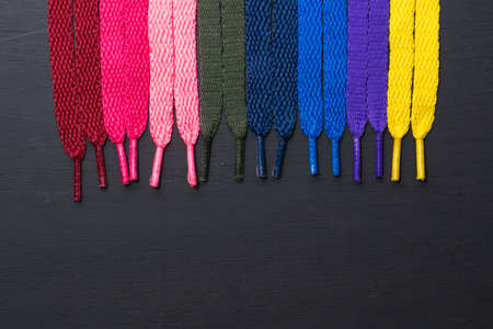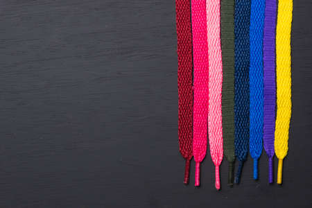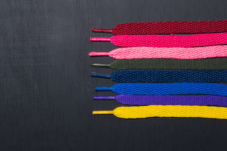 background of colored shoelaces on black wood, arranged horizontally, concept of perfection, leaving space for advertising text