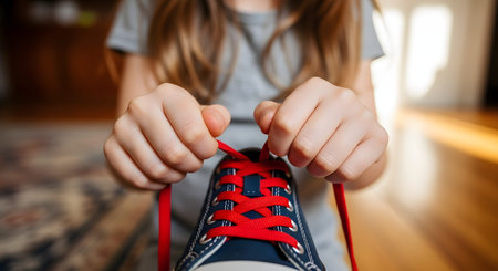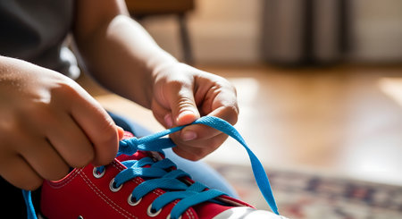 A child's hands focus on tying the blue shoelaces of a pair of bright red sneakers. This close-up captures a developmental milestone of learning a new skill and gaining independence in daily self-care routines.