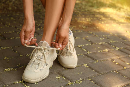 Woman tying shoe lace in outdoor.