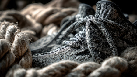 Detailed close-up shot of stylish footwear resting on twisted natural rope, featuring intricate textures and artistic focus, perfect for lifestyle or fashion themes.