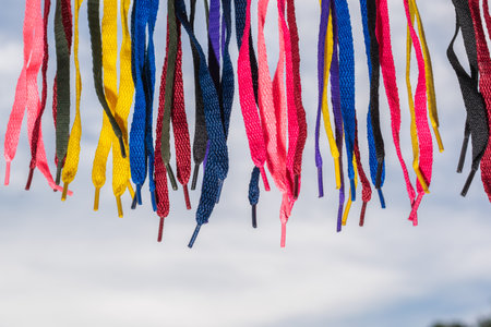 many colored shoelaces, hanging on a background of sky and clouds, pointed down