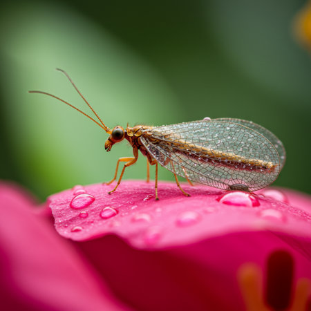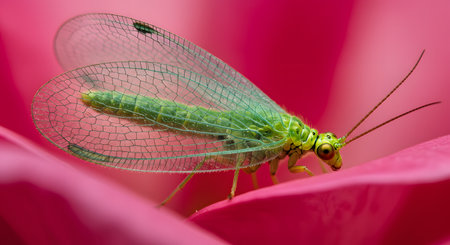 Vibrant Green Lacewing Insect on Bright Pink Flower Petal Macro Closeup