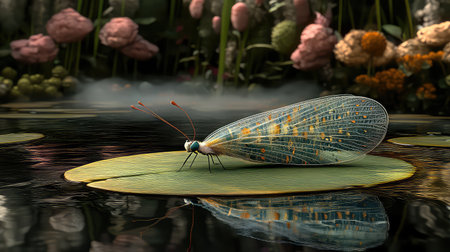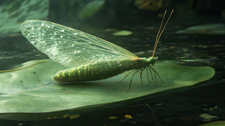 A serene close-up of a delicate insect with transparent wings resting on a leaf, surrounded by tranquil water, showcasing nature's intricate beauty and diversity.