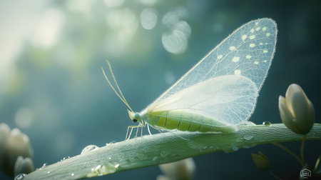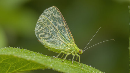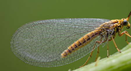 Macro shot of lacewing insect with transparent wings intricate lace pattern and delicate green body
