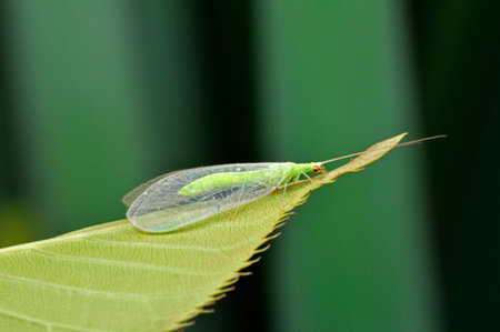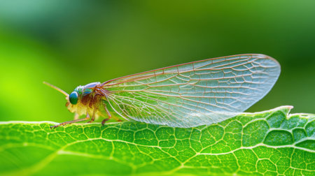 green lacewing perches lightly on a leaf, highlighting its slender body and large, delicate wings, suspended in a serene moment amidst a bright background.