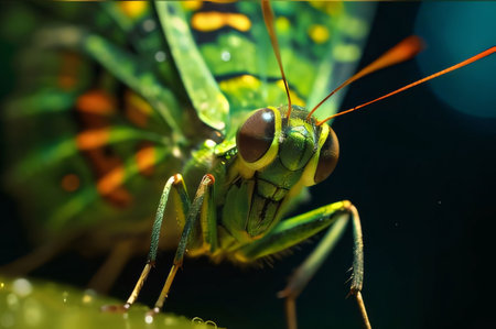 This stunning macro photograph captures the intricate detail of a vibrant green insect. Its striking features, including vivid colors and delicate textures, evoke the beauty of nature.