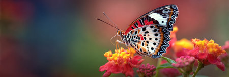 A striking butterfly with intricate patterns rests on bright flowers, showcasing rich colors while basking under sunlight in a lush environment