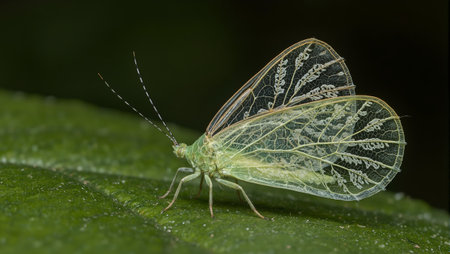 Macro shot of lacewing insect with transparent wings intricate lace pattern and delicate green body