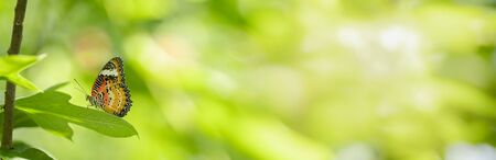 Close up nature view of orange butterfly on green blurred background in garden with copy space using as background insect, natural landscape, ecology, fresh cover page concept.