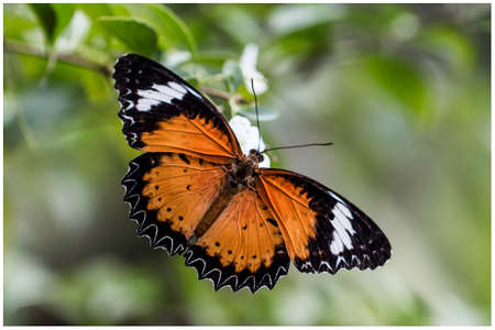 Leopard lacewing Cethosia cyane euanthes butterfly resting on plant.