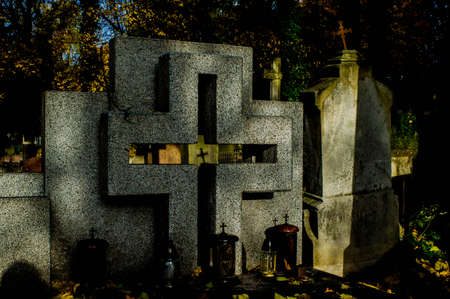 Historic cemetery in the city center of Warsaw. Green trees, monuments, crosses and sculptures. Old