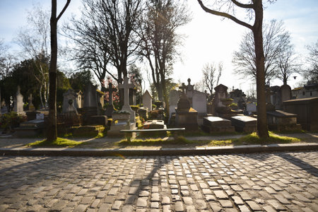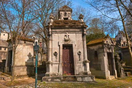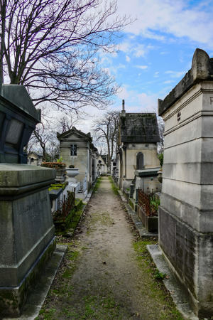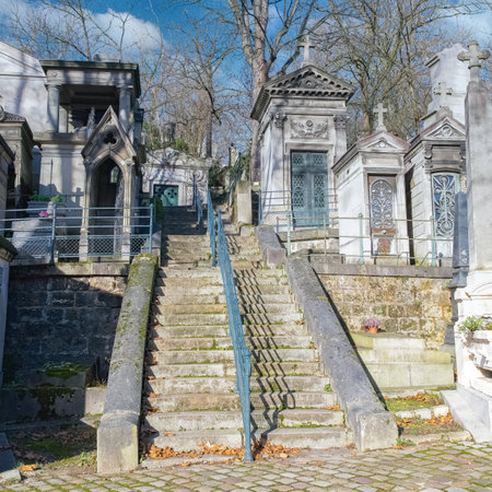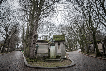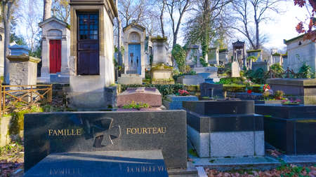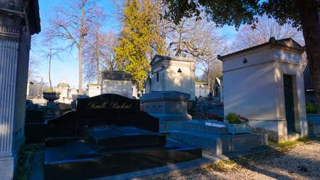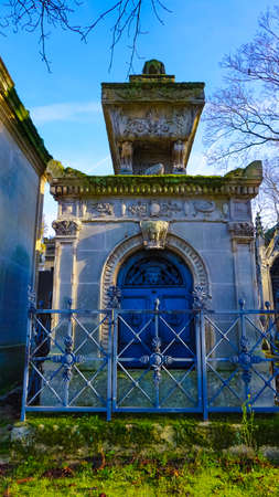 PARIS, FRANCE - DECEMBER 22, 2017: Graves from the 19th century in Pere Lachaise Cemetery in Paris, France, during a cold cloudy winter afternoon. Pere Lachaise Cemetery is the largest cemetery in Paris, hosting major french celebrities