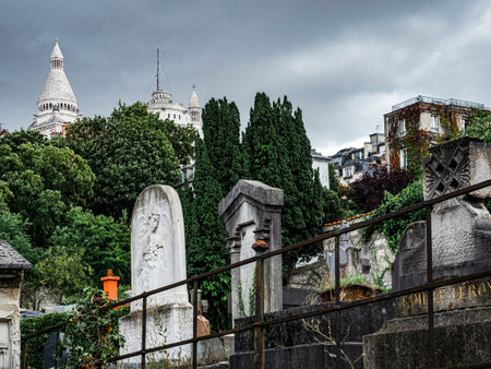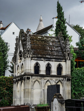 Paris, France - August 10, 2017. Tombs and monuments at old Montmartre cemetery which opened in 19th century and contains graves of many artists and famous people.