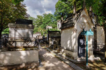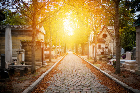 A view on autumn alley of the most famous cemetery of Paris Pere Lachaise, France. Tombs of various famous people. Golden autumn over eldest tombs