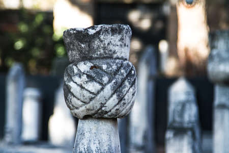 Ottoman grave stones in the Eyup Sultan Cemetery, One of the oldest and largest Muslim cemeteries in Istanbul on the banks of the Golden Horn, Turkey.