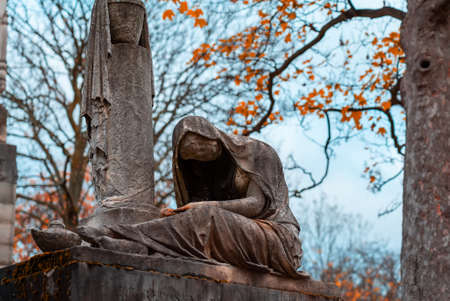 Old stone woman monument in the most famous cemetery of Paris Pere Lachaise, France. Tombs of various famous people. Golden autumn over eldest tombs