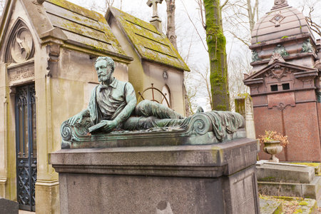 PARIS, FRANCE - FEBRUARY 21, 2015: Tomb of manufacturer Henri Leglise on Pere Lachaise Cemetery in Paris. Statue made by sculptor Edouard Rossel