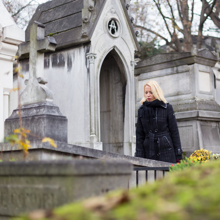 Solitary woman mourning by gravestone, remembering dead relatives in on Pere Lachaise cemetery in Paris, France.