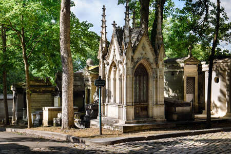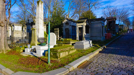 Paris, France - January 01, 2022: Graves and crypts in Pere Lachaise Cemetery, This cemetery is the final resting place for many famous people.