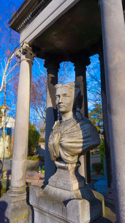 Stone bust in the most famous cemetery of Paris Pere Lachaise, France. Tombs of various famous people. Golden autumn over eldest tombs