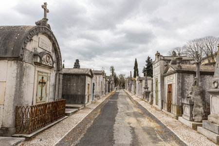 February 22, 2023 Lisbon, Portugal: Alto de Sao Joao Cemetery - the path between the crypts