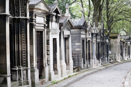 alley with line of stone crypts in Pere Lachaise cemetery, Paris