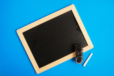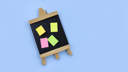 Mini wooden blackboard chalkboard with colourful sticky notes and copy space, isolated on blue background. Mini chalkboard for writing. Space for text. Landscape image