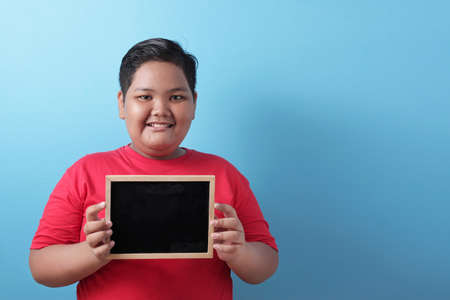 Portrait of healthy fat smart Asian boy smiling at camera while holding and showing empty blackboard or chalk board against blue background, copy space