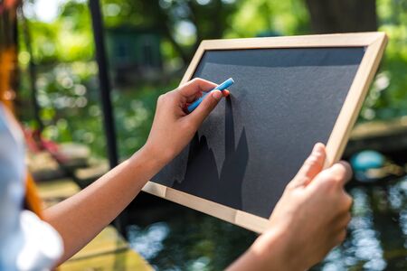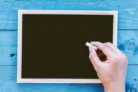 Hands use chalk for drawing, writing balckboard in the parks. Education, learning concept.