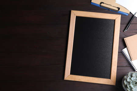 Clean small chalkboard, plant and stationery on wooden table, flat lay. Space for text