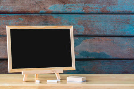 Wooden plank table for graphic stand product, interior design or montage display your product with blank texture blackboard with chalk for background. education concept.
