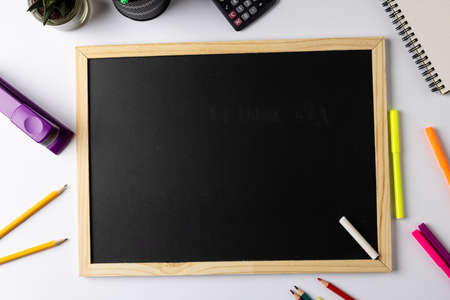 White office desk table with chalkboards. Top view with copy space, flat lay.