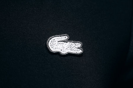 Nice, France - November 14, 2025: Lacoste crocodile logo with rhinestones in close up on black polo shirt