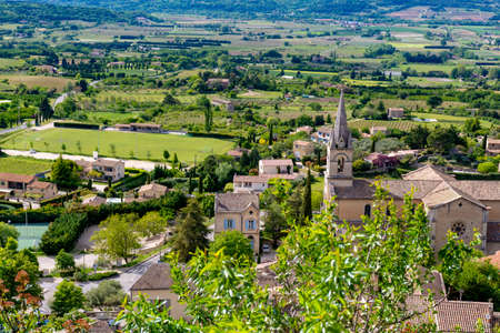 Panorama of Saint-Saturnin-les-Apt, France, with tower and building of the St. Etienne church. Provence village.