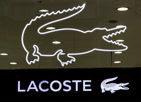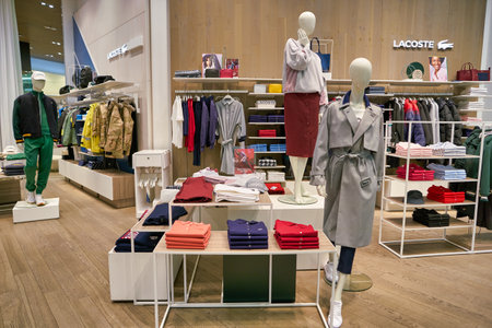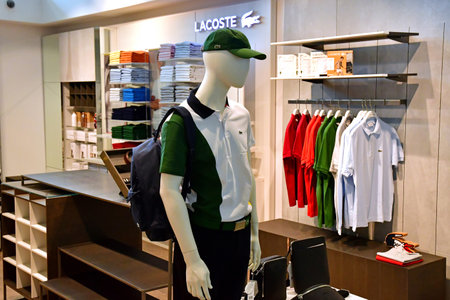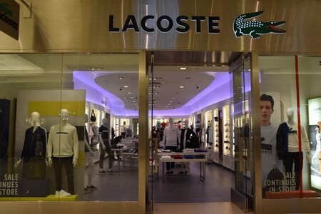 PENANG, MALAYSIA - NOV 24, 2017: Lacoste Store in Gurney Paragon Mall, Penang. French clothing company founded in 1933 that sells high-end clothing and most famously polo shirts.