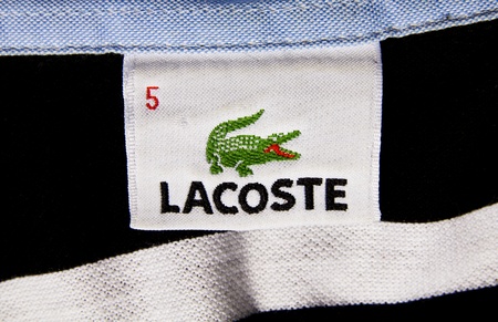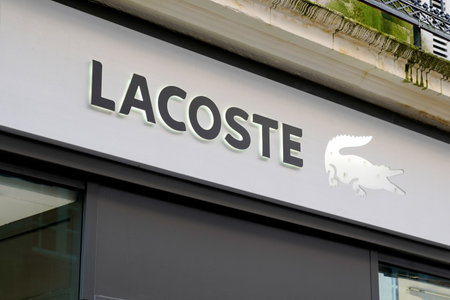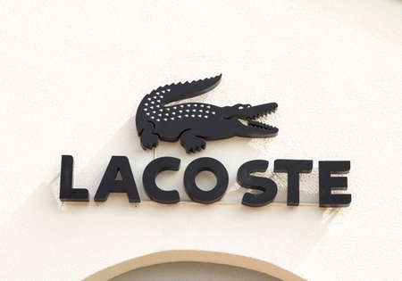 Closeup of Lacoste sign on store front, Lacoste
