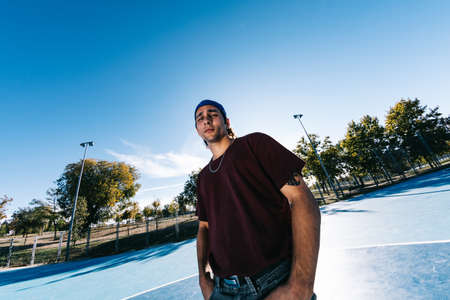 Young cool man break dancer standing in park. Tattoo on body