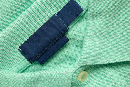 Blank blue laundry care clothes label on green shirt fabric texture background