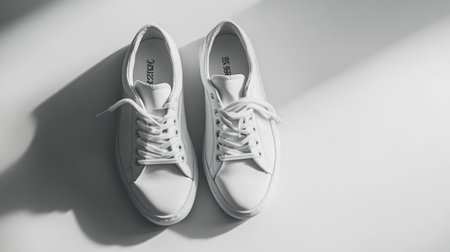 A pair of white sneakers on a white background, with a minimalist and clean aesthetic.