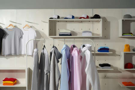 Clothes at custom clothing printing company. Set of blank pastel cotton white, gray, blue and pink sportswear on a rail in the store